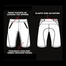 Featuring slanted front pockets with locking YKK Zipper and elastic side adjusters.